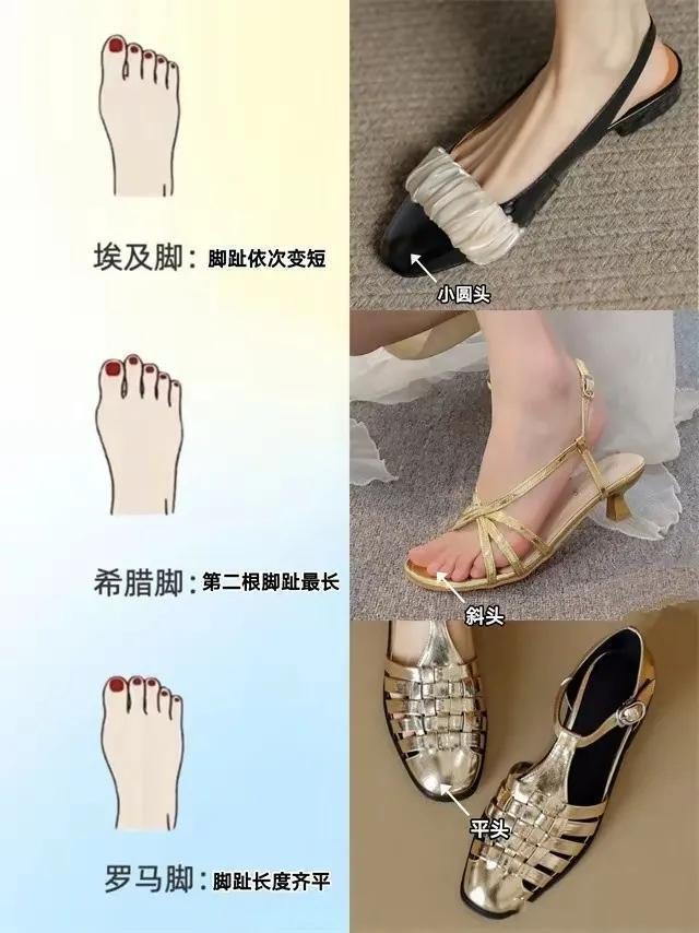 选择鞋子也是要根据自己的脚型而定,正常情况下来说分成下面这种三类脚型,埃及脚、希腊脚、罗马脚,如果你的脚比较宽的情况下,尽量选择方头或者是圆头的单鞋,你的脚比较窄的情况下,这个时候我们可以选尖头鞋,高跟单鞋穿在脚上都很好看。