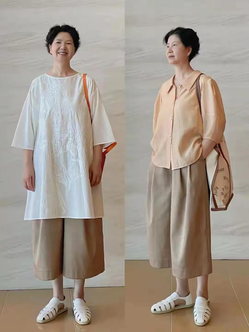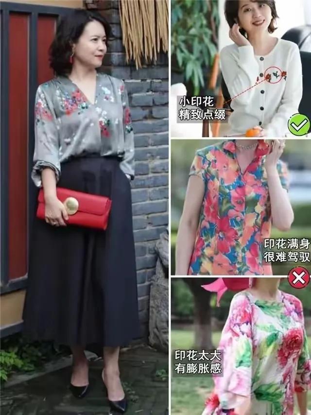 上面这位达人还是一个比较年轻的女性,如果当你到了五六十岁的情况下,身材就容易发福发胖,这时候还选择花哨的衣服,那么真的很难驾驭,咱们就看右下角这两件印花的衬衫,或者是连衣裙,穿在身上就显得有点膨胀感,而且不够高级。