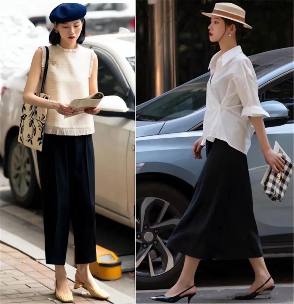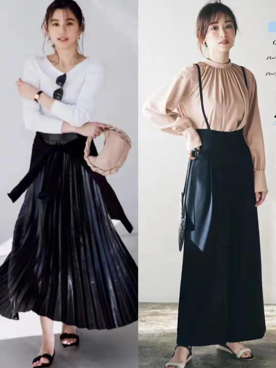有的衣服印花过于老气,穿在身上就会显得土味十足,正常情况下来说不太会穿衣配色的普通大众女性,还是选择纯色系甚至最为基础的黑白灰来穿搭,会能降低出错率,例如右边这位达人选择了白色衬衫上衣搭配上黑色的伞状半身裙,这样的穿衣打扮不光显得高级大气,而且还显得很减龄,非常适合咱们普通大众女性接近穿搭。