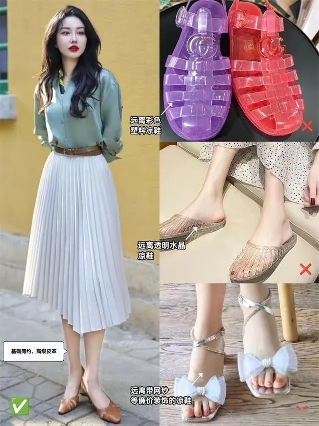 想要变得更加好看,不管是中年女性还是美少女,鞋子的款式也很重要的,例如下面这四双鞋子,右边的这三双鞋子穿在脚上会马上显得廉价,我们应该选择浅口的皮质单鞋,这种皮质的浅口单鞋搭配上白色的百褶半身裙和雪纺衬衫,确实能够提升整体造型的档次。