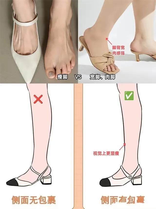 接着咱们再来看下面脚型的不同穿法,你的脚偏瘦,这个时候是不是选择白色的前后尖头高跟单鞋来穿,会显得特别好看。但是如果你的脚比较宽,而且看起来是那种肉肉的脚型,那么穿低跟的穆勒鞋会更好看。